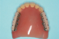義歯の歯をメタルブレード(義歯のページを参照)にして、硬いものでも噛める入れ歯に仕上げました。