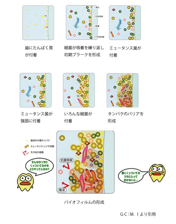 虫歯菌、歯周病菌は沢山の菌と手をつないでバイオフィルムという菌塊を作ります。
